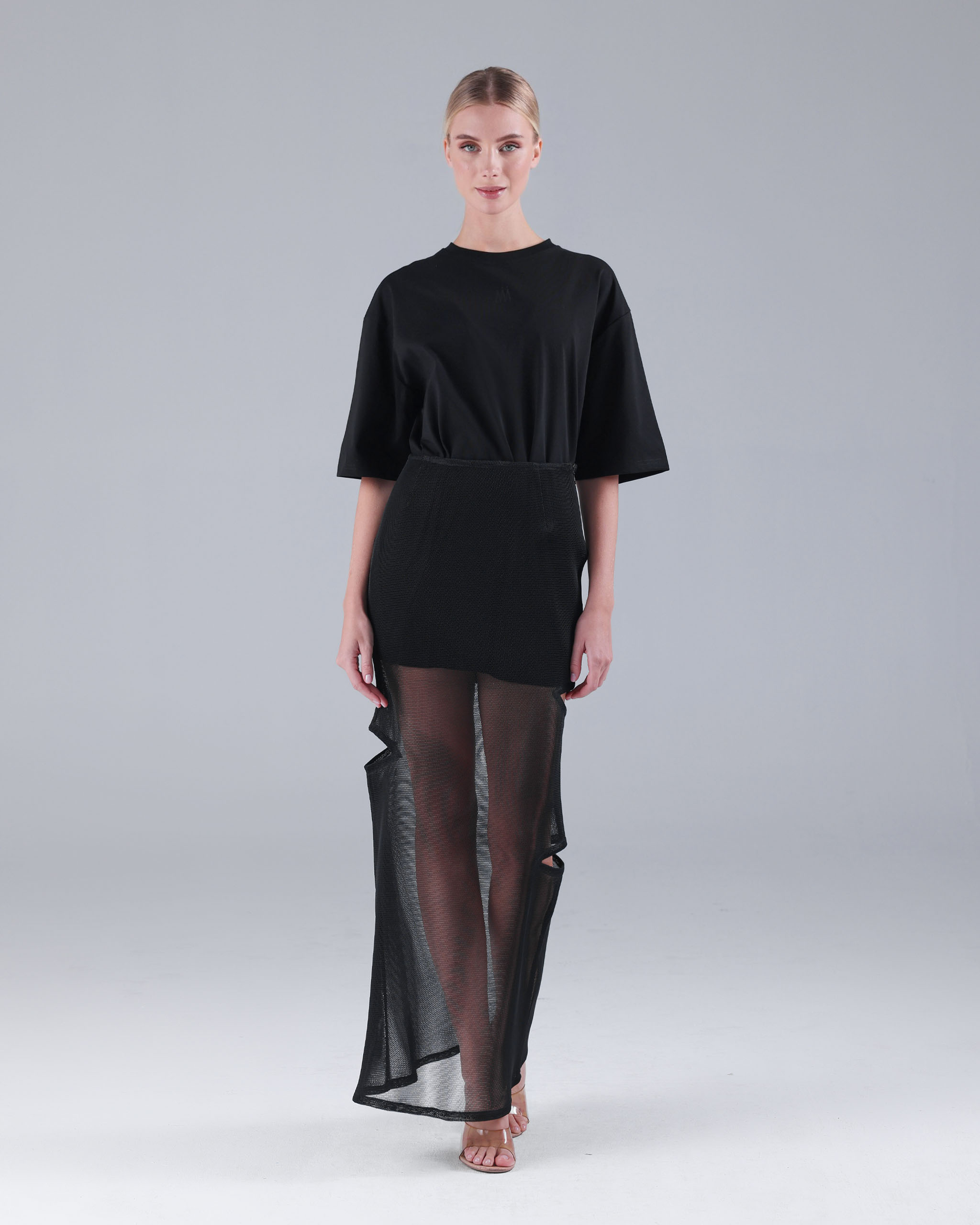 Our cut out maxi skirt features a snatched silhouette that flares from the knee down creating a striking shape. The bold design includes three geometric cutouts throughout, adding an edgy twist to the long, flowing lines. This product does not include any inner pieces or shirts. It is only the mesh skirt.