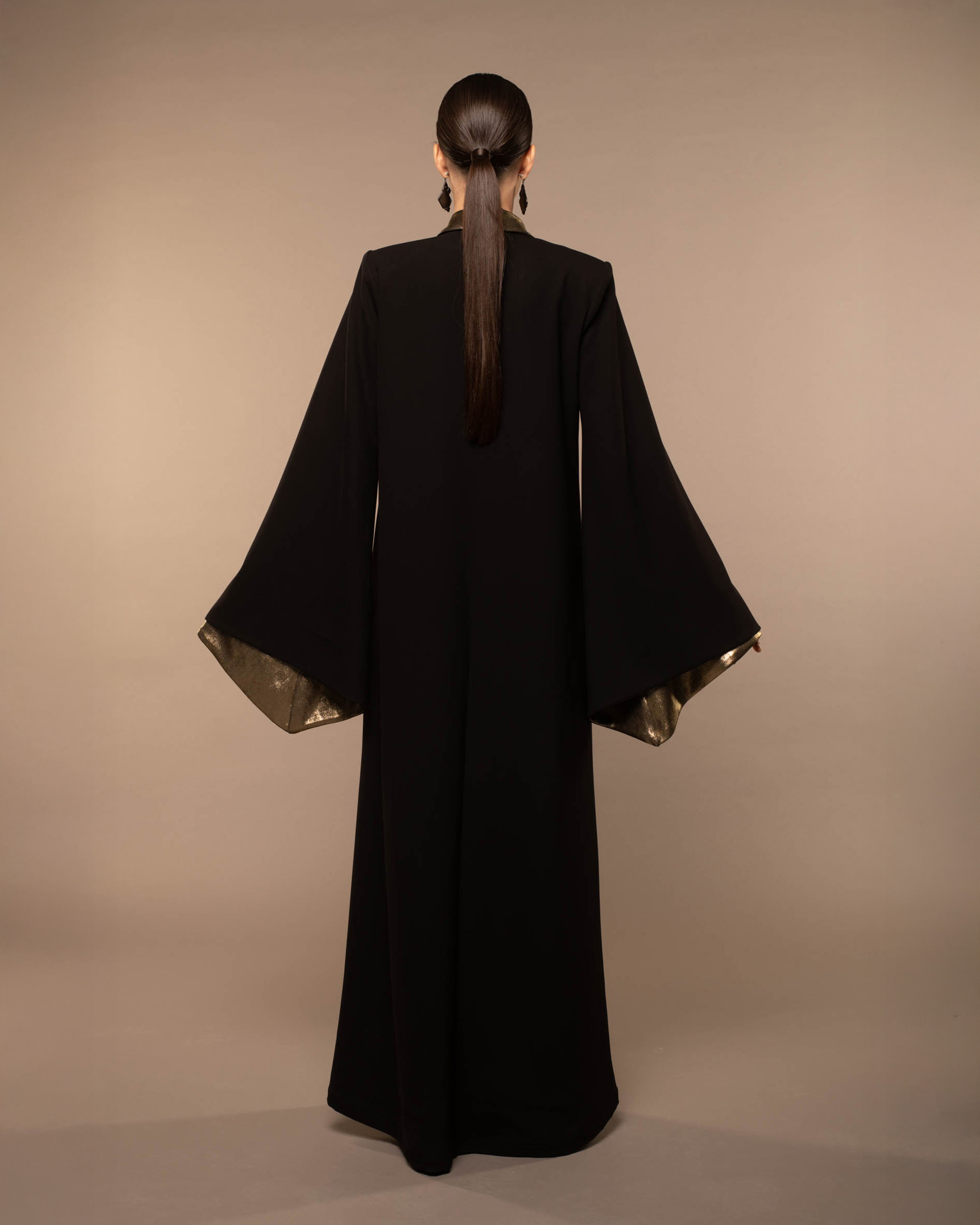 Featuring a structured silhouette with shoulder pads for a refined shape, it is accented with golden metallic jersey at the collar and inside the sleeves for a subtle contrast. Finished with the signature branded metal logo at the back, this piece blends modern tailoring with timeless Ramadan elegance.