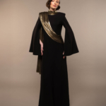 This elegant Ramadan dress is crafted from smooth crepe, accented with golden metallic jersey at the neckline and in a sculpted draped detail for a luxurious touch. Designed with slit sleeves, it creates a striking yet fluid silhouette. A refined statement piece, perfect for elevated Ramadan evenings and special gatherings.
